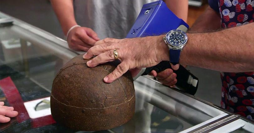在這一期節(jié)目中,一位顧客帶來了一個被認(rèn)為是鐵做的頭盔。一位專家證實,這是一個約有1500年歷史的真正的盎格魯-撒克遜頭盔。這頂頭盔完好無損,是一件非常罕見的古董。通常情況下,鐵會在有氧氣存在的環(huán)境中分解,因此這個頭盔很可能被遺留在如沼澤或河流等的缺氧環(huán)境中而得以完好保存。