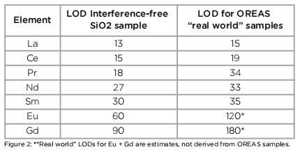 手持設備中的典型的X射線管只能工作到50 kV,稀土元素的有效激發(fā)能量差。而SciAps X-555采用55 kV的X射線管,大約能產(chǎn)生10倍以上的X射線有效激發(fā)能量。無干擾(二氧化硅)和高度具有挑戰(zhàn)性的OREAS REE礦石的值(這可以在圖2中找到)。LOD用于背景以上的3西格瑪檢測,120秒的測試時間。Sciaps光譜儀可作為化探手段。有規(guī)劃的進行土壤、巖石露頭測試,剖面測試,光譜數(shù)據(jù)可作為地質資料。常用礦石模式和土壤模式。無需進行樣品制備或簡單樣品制備。