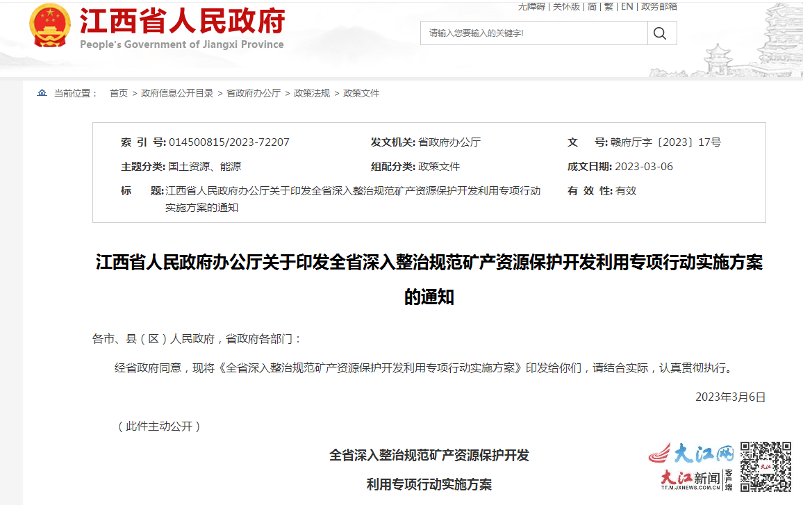 日前,江西省人民政府在其官方網(wǎng)站上發(fā)布了《全省深入整治規(guī)范礦產(chǎn)資源保護(hù)開(kāi)發(fā)利用專項(xiàng)行動(dòng)實(shí)施方案》(下稱《方案》),從礦業(yè)權(quán)設(shè)置審批、礦山開(kāi)采監(jiān)管、規(guī)范礦山企業(yè)經(jīng)營(yíng)、礦山生態(tài)修復(fù)、建設(shè)綠色礦山、礦山安全生產(chǎn)和產(chǎn)業(yè)鏈供應(yīng)鏈安全等方面提出了六大措施,深入整治規(guī)范礦產(chǎn)資源保護(hù)開(kāi)發(fā)利用。
