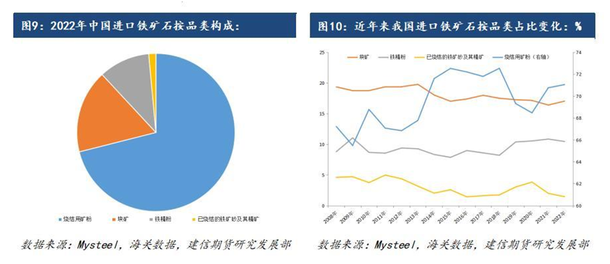 從進口品類來看,我國燒結(jié)用粉礦占比最高,2022年占比約為71.0%;塊礦居次,占比約為17.0%;鐵精粉第三,占比約為10.5%;已燒結(jié)的鐵礦砂占比最小僅為1.5%。