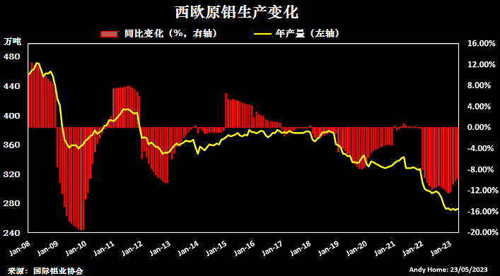 過去15年中,西歐原鋁產量持續下降,從過去的450萬噸降至目前的270萬噸。