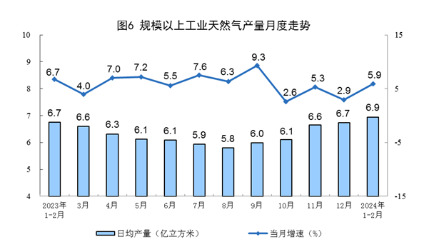 天然氣生產(chǎn)增速加快,進(jìn)口保持較快增長。1—2月份,規(guī)上工業(yè)天然氣產(chǎn)量417億立方米,同比增長5.9%。進(jìn)口天然氣2210萬噸,同比增長23.6%,增速比上年12月份放緩0.1個(gè)百分點(diǎn)。