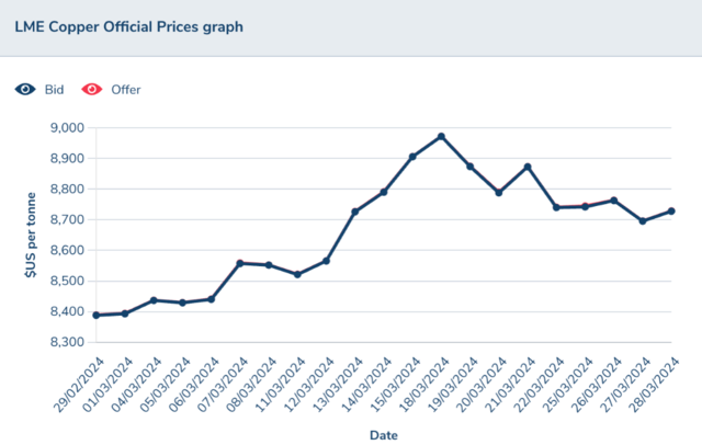 3月份以來全球銅價持續走高,3月16日,國際銅價(LME銅)一度上破至9000美元/噸關口;截至當前,國際銅價依然超過8700美元/噸。