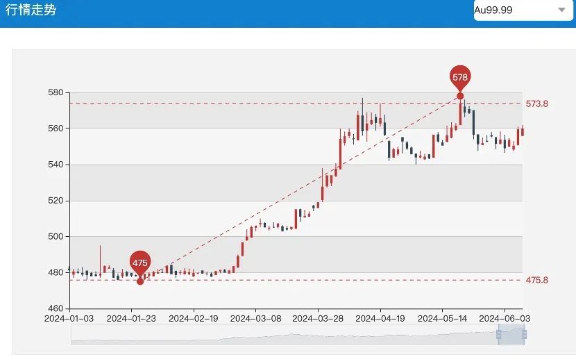 拉長時間看,盡管近期現(xiàn)貨黃金價格有所回落,但年初至6月7日漲幅仍超11%。國內金價亦不斷攀升,上海黃金交易所AU9999年內最高觸及578元/克,較年初低點475元/克漲幅達21.68%。