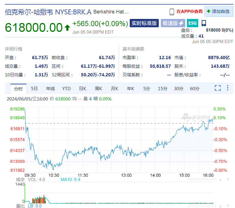 據(jù)悉,巴菲特從2019年首次投資西方石油,2022年一季度開始連續(xù)三個(gè)季度大幅增持。今年2月初,巴菲特曾連續(xù)三個(gè)交易日增持西方石油,累計(jì)購(gòu)買430萬(wàn)股。截至當(dāng)?shù)貢r(shí)間6月5日收盤,伯克希爾-哈撒韋美股報(bào)618000美元,漲幅0.09%,市值8879.40億美元。