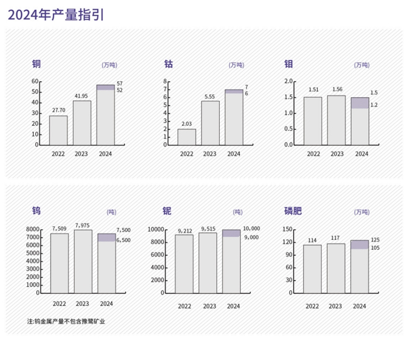 上半年,洛陽鉬業銅金屬產量同比增長約101%,達到31.38萬噸,半年產銅量已完成了全年任務的58%,全年產銅量大概率將突破年初52萬噸至57萬噸產量指引的上限,成為2024年全球礦產銅最大的增量來源;上半年,洛陽鉬業鈷金屬產量同比增長約178%,達到5.40萬噸,完成全年任務的83.6%,穩固全球第一大鈷生產商地位。