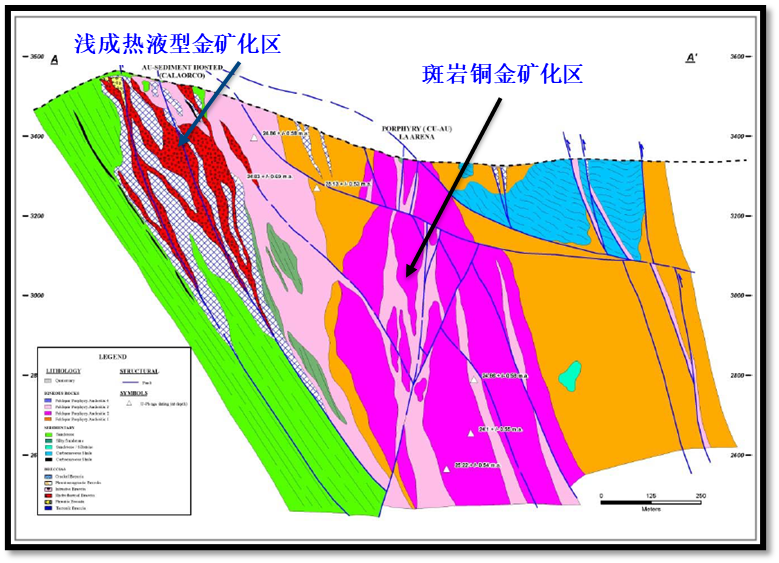 La Arena項目有兩種礦床類型,分別為西南部的高硫淺成低溫熱液型金礦床和東北部的斑巖型銅金礦床,礦體整體呈“上金下銅”狀態分布。