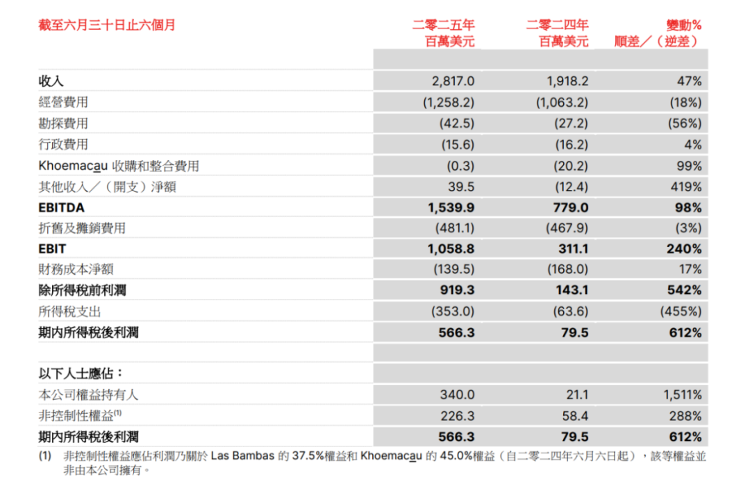 8月12日晚間,五礦資源披露半年業(yè)績(jī),2025年上半年,五礦資源實(shí)現(xiàn)收入28.17億美元,同比增長(zhǎng)47%;除稅后利潤(rùn)達(dá)5.663億美元,與上年同期的0.795億美元相比,實(shí)現(xiàn)了612%增長(zhǎng);公司權(quán)益持有人應(yīng)占利潤(rùn)3.40億美元,與上年同期的0.211億美元相比,實(shí)現(xiàn)了超過(guò)15倍的增長(zhǎng)。