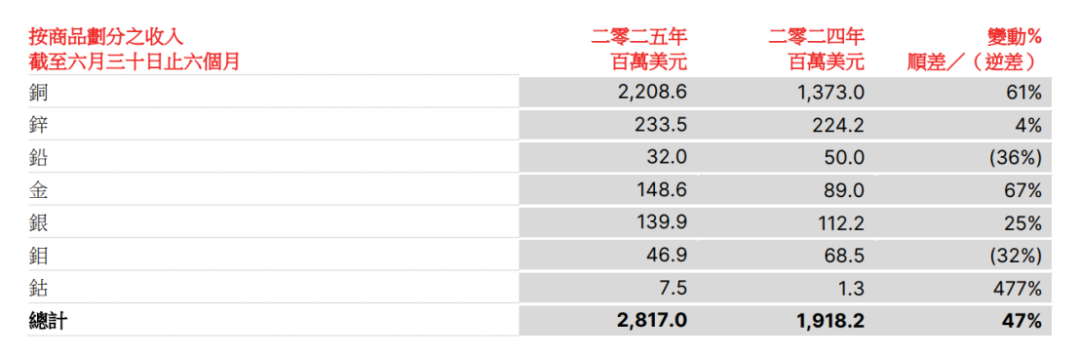 2025年上半年,倫敦金屬交易所(LME)金、銀、鈷等金屬價(jià)格分別上漲39%、26%、7%,也帶動(dòng)五礦資源相關(guān)板塊營(yíng)收的增長(zhǎng)。當(dāng)然,五礦資源業(yè)績(jī)的“爆發(fā)”主要得益于銅板塊的量?jī)r(jià)齊升!