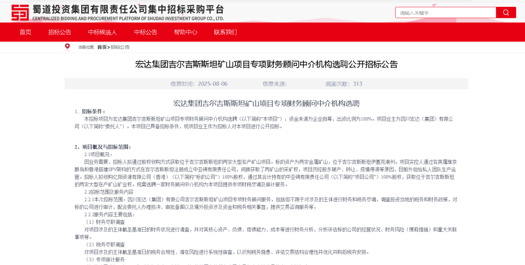 消息源于蜀道投資集團集中招標(biāo)采購平臺發(fā)布的《宏達集團吉爾吉斯斯坦礦山項目專項財務(wù)顧問中介機構(gòu)選聘公開招標(biāo)公告》。公告顯示,宏達集團計劃收購億陽資源有限公司 (香港) 100% 股權(quán),通過這一操作,將間接掌控中亞錫有限責(zé)任公司100% 股權(quán),進而獲取位于吉爾吉斯斯坦伊塞克湖州的兩宗大型在產(chǎn)礦山礦業(yè)權(quán)。為順利推進收購,宏達集團正在公開選聘一家財務(wù)顧問中介機構(gòu),為項目提供專項財稅盡調(diào)及審計服務(wù),項目資金全部來源于企業(yè)自籌。